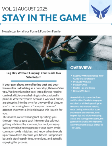 A newsletter to our entire Form and Function Family to keep you updated on all the happenings in the clinic and to share helpful, entertaining information about your health and wellness. Find helpful tips and tricks on staying active and staying in the game, the game of life that is! We hope you enjoy this month’s issue of Stay In The Game!