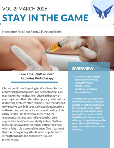 A newsletter to our entire Form and Function Family to keep you updated on all the happenings in the clinic and to share helpful, entertaining information about your health and wellness. Find helpful tips and tricks on staying active and staying in the game, the game of life that is! We hope you enjoy this month’s issue of Stay In The Game!